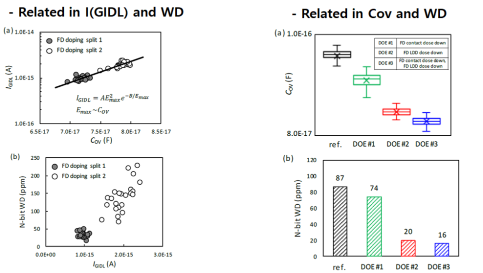 끝으로, 결과값을 비교한 그래프를 보게되면 FD의 도핑농도 즉, Drain의 도핑 프로파일에 따라 그래프 분포에 차이를 보이며, 도핑 프로파일이 작은 검정색으로 표현된 스플릿1(반대로 Cov = FD의 용량은 낮음)이 더욱 낮은 White Defect을 가지고 있음을 확인할 수 있다.