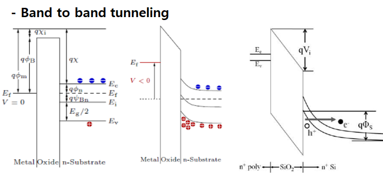 그리고 마지막 그림처럼 전압이 과하게 들어가게되면, valance band의 바로 옆에 conduction band가 위치하는 그림이 되어 밴드 갭이 충분히 크지 않다면, 터널링으로 슝슝 이동할 수 있게 된다. 이로 인해 원치않는 전자의 이동이 발생해 defect이 발생하게된다.