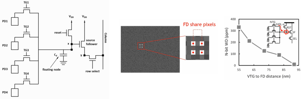 마지막 그림에서 볼 수 있듯이, FD와 TG(VTG)의 거리가 멀어질수록 N-bit WD 즉, 공유된 픽셀의 white defect가 눈에 띄게 줄어드는 것을 알 수 있다.