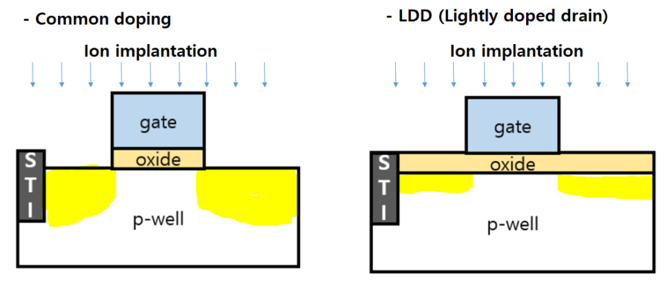 왼쪽은 일반적인 이온 임플란테이션으로 도핑이 정상적으로 깊게까지 된다, 반대로 LDD기법을 사용하게되면 실리콘 기판위에 보호막역할을 하게된 oxide를 깔고 이온폭격을 해줌으로서, 도핑이 좀 더 얕게 깔리게 된다.