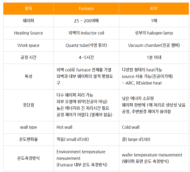 RTA는 자외선을 사용해 웨이퍼에 수직으로 조명을 쬐어주는 방식이고 Furnance는 마치 빵을 굽는 오븐에 wafer을 넣어 열처리를 해주는 방식이라고 생각하면 쉽게 이해가 될것이다.