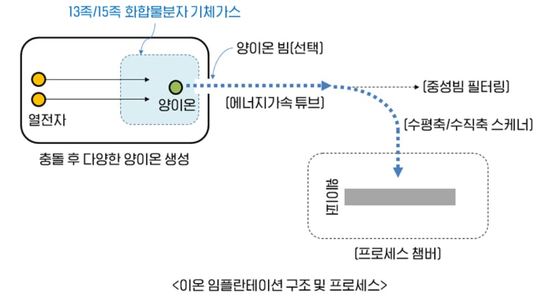 위 그림들은 이온 주입공정에 사용되는 장비의 개략도 및 프로세스이다.