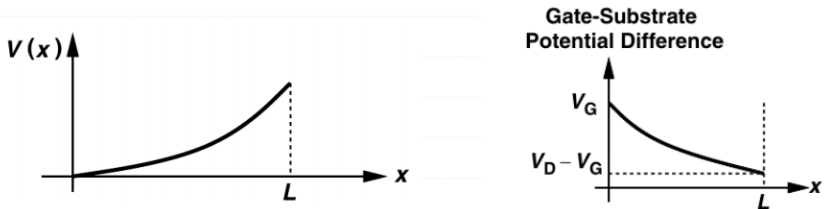 이렇듯 potential 차이로 인해 gate아래의 channel은 비스듬하게 형성되어 source쪽에 더 많은 전자가 분포하게된다.